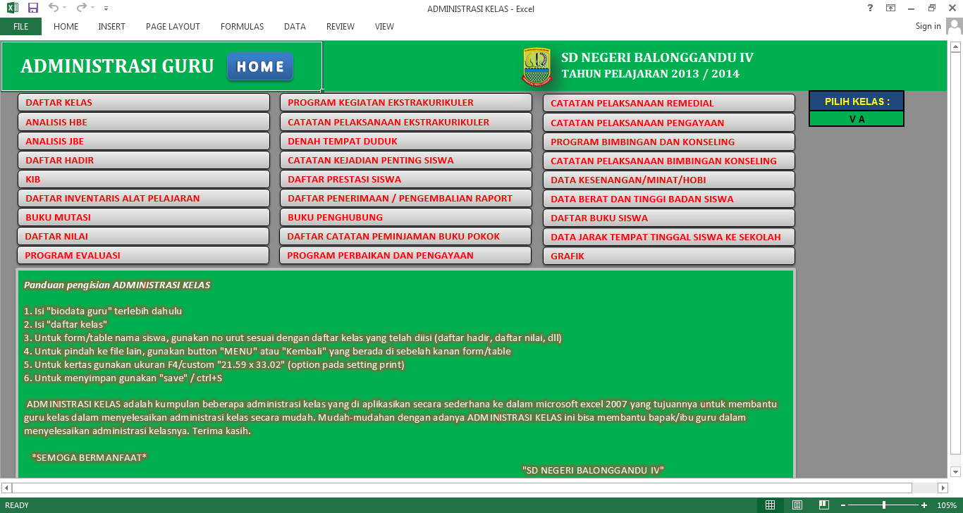 Semua bentuk administrasi Kelas tersebut dapat tersimpan dan dibuat dengan memanfaatkan Aplikasi Pengadministrasian Kelas untuk SD, SMP, SMA dan Sederajat. Aplikasi ini dibuat menggunakan Excel, yang tentunya akan sangat familiar dan mudah dalam penggunaanya. Berikut beberapa tampilan dari Aplikasi Pengadministrasian Kelas untuk SD, SMP, SMA dan Sederajat versi Excel.